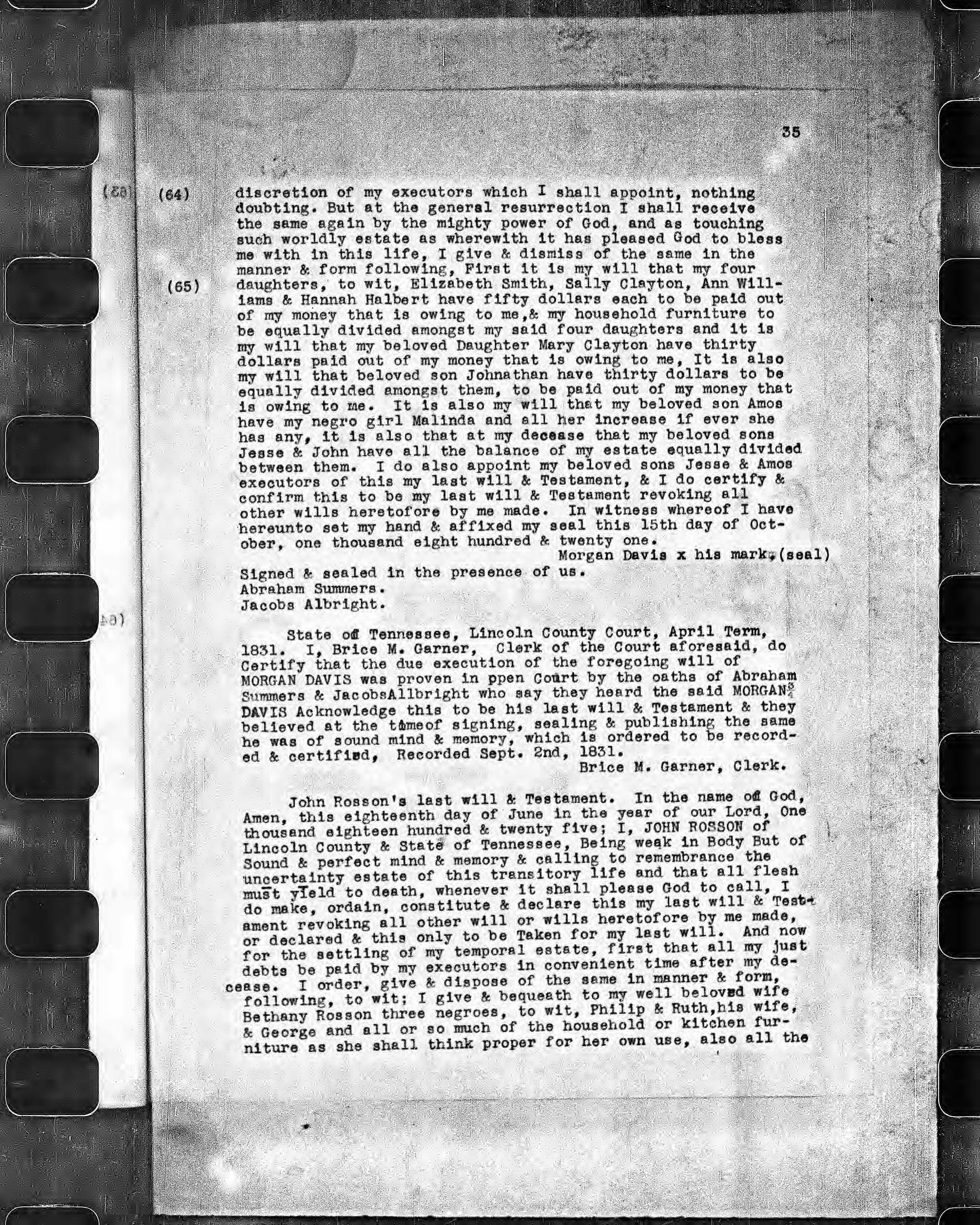 - John Rosson's last Will & Testament. In the name of God, Amen, this eighteenth day of June in the year of our Lord, One thousand eighteen hundred & twenty five; I, JOHN ROSSON of Lincoln County & State of Tennessee, Being weak in Body but of Sound & perfect mind & memory & calling to remembrance the uncertainty estate of this transitory life and that all flesh must yield to death, whenever it shall please God to call, I do make, ordain, constitute & declare this my last will & Testament revoking all other wills heretofore by me made, or declared & this only to be Taken for my last Will. And now for the settling of my temporal estate, first that all my debts be paid by my executors in convenient time after my decease. I order, give & dispose of the same in manner & form following, to wit: I give & bequeath to my well beloved wife Bethany Rosson three negroes, to wit, Philip & Ruth, his wife, & George and all or so much of the household or kitchen furniture as she shall think proper for her own use, also all the stock of every description, & the plantation utensils during her life or widowhood, provided neverless that if she see cause to give away any part of the property in her lifetime, that the same be equally divided amongst my six children hereafter named, and all the property not specially named to the legatees in this will, is at my death & the death of my wife, then to be equally divided amongst my six children to wit, Sarah S. Bagley, wife of Nathan Bagley, & Joseph Rosson, William Rosson & Mishael Cook wife of Nanis Short, & Henry B. Rosson & Candia Short, wife of John Short. Item, I give to my daughter Sarah S. Bagley one negro boy named Anthony. I give & bequeath to my son Joseph one negro girl named Nancy. I give and bequeath to my son William Rosson one negro boy named Wright. I give and bequeath to my daughter Mishael Cook 1 negro boy named Philip. I give & bequeath to my son Henry B. Rosson 1 negro Girl named Nelly. I give & bequeath to my daughter Candia Short, 1 negro boy named Willie. I give & bequeath to my grand daughter Matilda McMaster 1 negro girl named Mary, to her & her heirs forever. Nevertheless, if the said Matilda should die without heir, then the said negro girl Mary is to return to my children, to be equally divided amongst my six children, above named. Also I give & bequeath to the said Matilda McMaster, one horse, bridle & saddle, one bed & furniture & Bedstead, one cow & calf, one ewe & lamb, Also the land on which I now live I give & bequeath to my two sons Joseph & Henry B. Rosson, one hundred acres each, to be divided by a line beginning in the middle of the North boundary line & running due South to the middle of the South boundary line, William Rosson to have the west end, & Henry B. Rosson to have the east end, it is also my will that the three negroes named in the forpart of the will for the support of my wife & self during our lives & one girl named Priscilla that my three daughters have each one, Sarah S. Bagley, Mishael Cook, & Candia Short, each of which negroes is to be valued so that each one's part shall be equal & the remaining negro or negroes, if that should be the case, are to be valued or sold, also all the household & kitchen furniture & all the Stock of every description with plantation utensils, are to all be valued or sold, as my Executors hereafter named, shall think best, and the whole Amount arising therefrom to be equally divided amongst my six children above named, to wit, Sarah S. Bagley, Joseph Rosson, William, Mishael Cook, Henry B. Rosson & Candia Short. I, also constitute, ordain & appoint my three sons, Joseph Rosson, William Rosson & Henry B. Rosson executors to this my last will & Testament, revoking & annulling all other will or wills heretofore by me made, and these my executors will execute & perform all things according to the true intent & meaning herein contained.